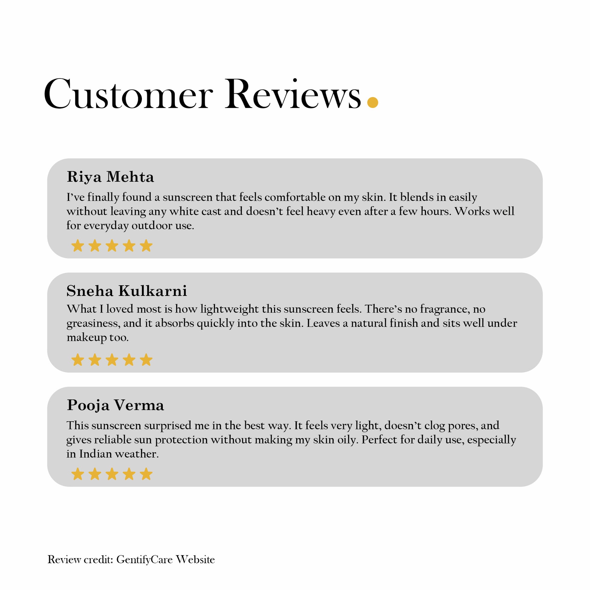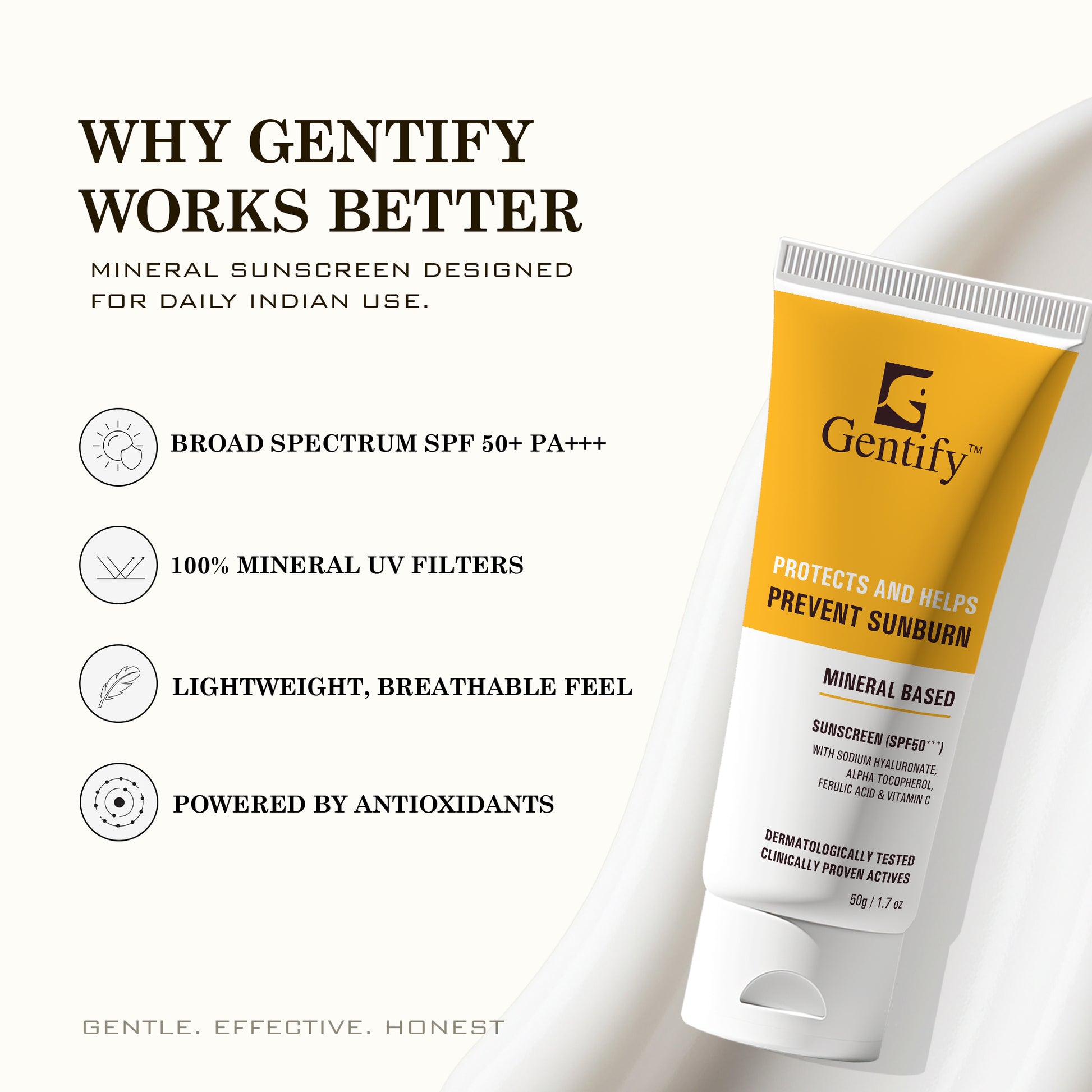 Gentify Care Mineral Sunscreen SPF 50+++ with Vitamin C, E, Hyaluronic Acid & Ferulic Acid – Hydrating & Antioxidant Protection